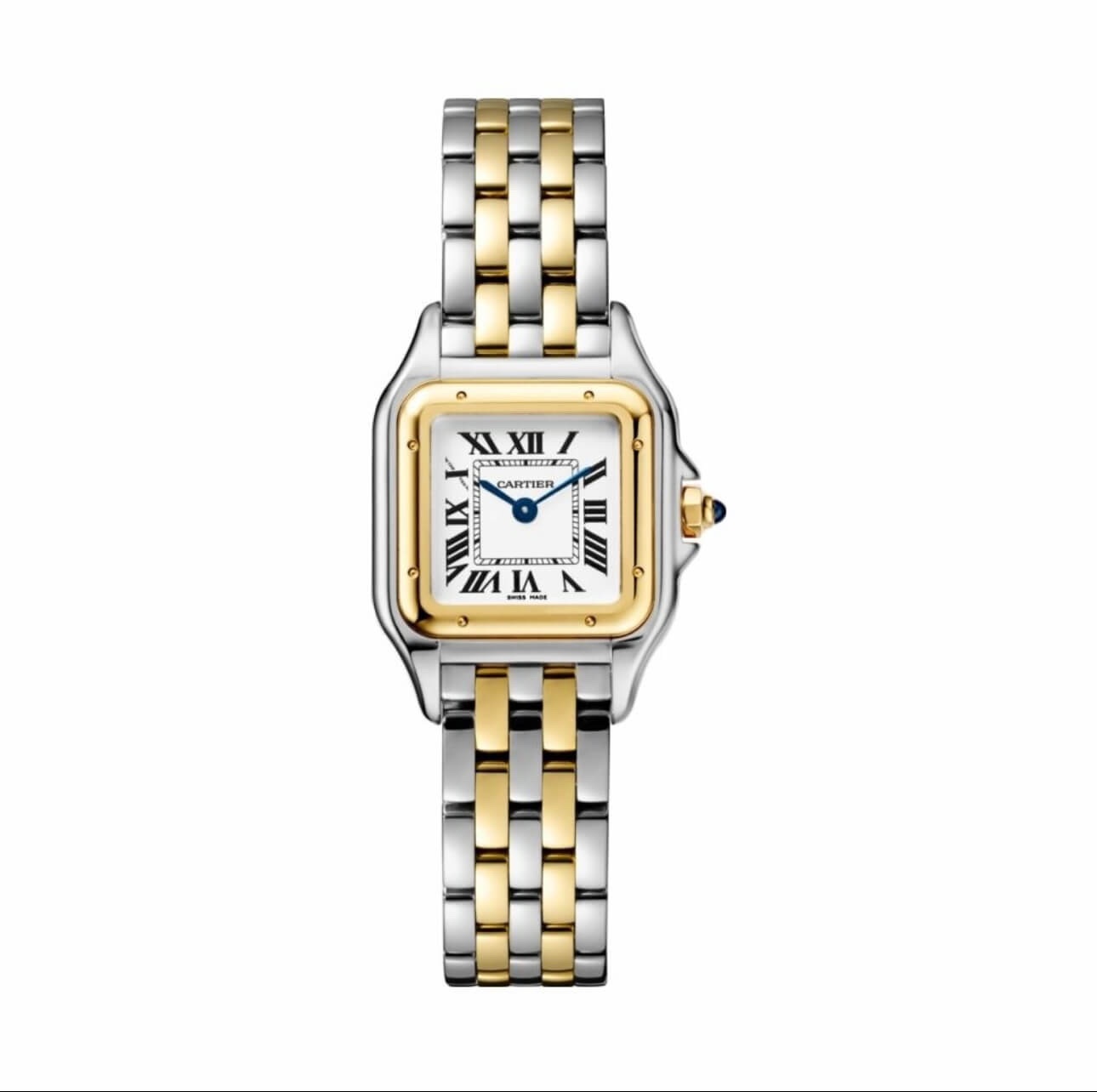 🔹 MOUVEMENT: Quartz 🔹 BOÎTIER : Matériau : Acier inoxydable 316L + finition or 18K (placage premium), Taille : 27 × 36 mm, Épaisseur : 8 mm, Forme carré arrondie, signature Cartier, Couronne sertie d’un cabochon bleu, Résistant, brillant, très noble. 🔹 CADRAN : Couleur : Blanc lumineux, Chiffres romains noirs classiques, Aiguilles bleues en forme de glaive, Cadran sobre & luxueux. 🔹 VERRE : Verre saphir durci, Anti-rayure, Anti-reflet. 🔹 BRACELET : Bracelet bicolore argent/or, Acier inoxydable 316L + placage or, Maillons serrés pour un confort parfait, Fermoir invisible sécurisé, Tenue très élégante, idéale pour femmes distinguées. 🔹 ÉTANCHÉITÉ: 30 mètres / 3 ATM, Résiste aux éclaboussures. 🔹 QUALITÉ : Version Premium AAA top qualité), Poids réaliste, Finitions très haut de gamme, Correspond parfaitement au modèle authentique.