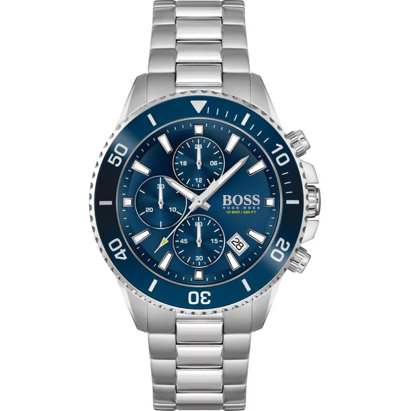 Montre BOSS hommes – Admiral 1513907 Déclinée dans un large éventail de coloris, cette montre BOSS pour hommes sait comment s’y prendre pour nous séduire… Afin de raviver nos envies de grand large et d’évasion, elle a opté pour un design inspiré de l’univers nautique. Encerclé par une lunette rotative aux graduations bien visibles, son cadran est ainsi habillé du bleu intense de l’océan… Survolant le tout en cadence, un duo d’aiguilles luminescentes nous guide avec clarté dans l’espace temps. Mais cette montre BOSS fait également preuve d’une fonctionnalité à toute épreuve. Chronographe ou encore guichet de date: elle est si pratique qu’elle n’aura aucun mal à se rendre incontournable. – indication de la date – chronographe – 24 heures – cadran bleu balayé de subtils reflets – bracelet ajustable en acier inoxydable – lunette rotative unidirectionnelle graduée – aiguilles et index visibles dans l’obscurité