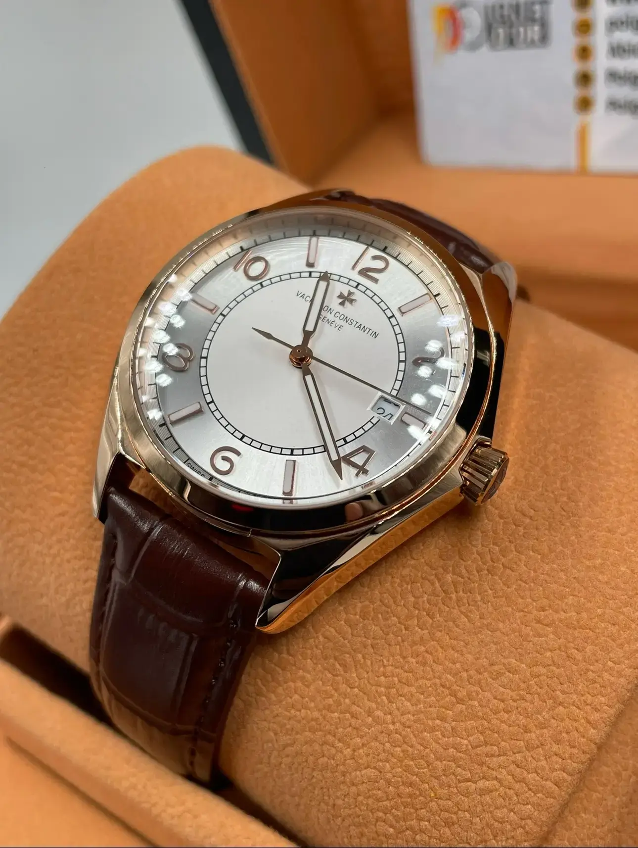 _Mouvement : Automatique Miyota 4A (précision japonaise haut de gamme) _Qualité : AAAA+ Premium (niveau supérieur) Boîtier : Acier inoxydable 916L plaqué or rose _Diamètre : 41 mm _Épaisseur : 12 mm _Cadran : Argent satiné avec index et chiffres dorés _Verre : Saphir minéral anti-rayures et anti-reflets _Bracelet : Cuir véritable marron façon alligator, boucle ardillon _plaquée or rose _Fond : Transparent laissant apparaître le rotor automatique _Fonctions : Affichage de la date à 3h Heures, minutes, secondes centrales Étanchéité : Résistante à 10 ATM (pluie et éclaboussures) Garantie : 3 ans Poignet d’Or 🌟 Points forts : Mouvement automatique Miyota 4A : fluide, silencieux et durable Design inspiré des montres suisses classiques Finition AAA+ Premium, matériaux nobles et précision d’assemblage Bracelet en cuir véritable confortable et élégant Idéale pour une tenue chic, business ou de cérémonie
